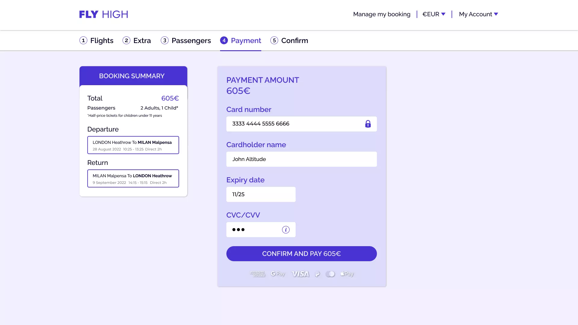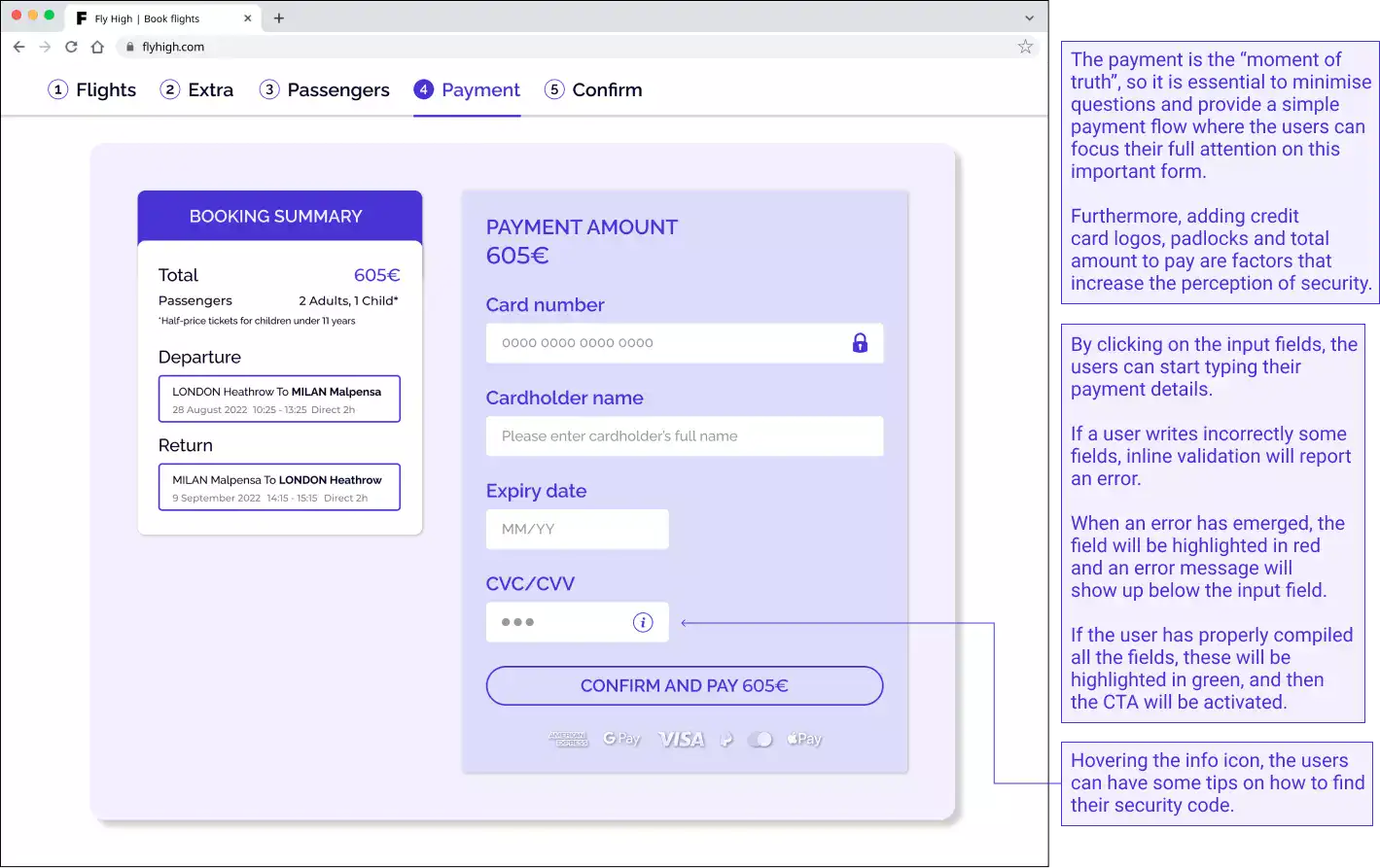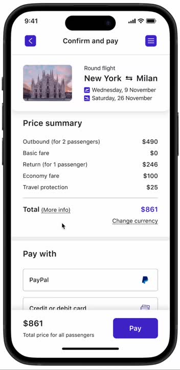 Guiding the user to a secure payment at the end of the booking process, while allowing currency changes directly on the page.
