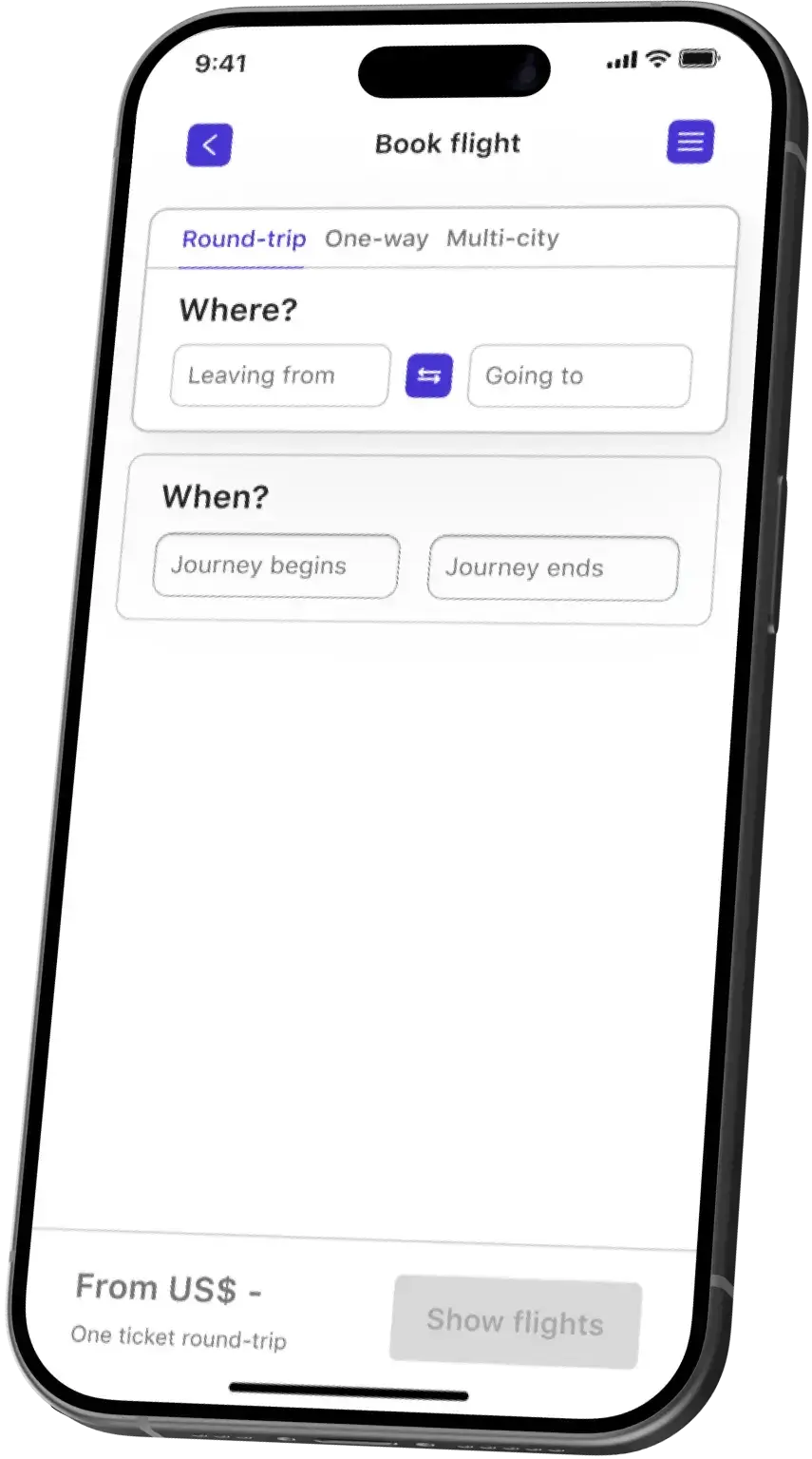 Flight apps require users to enter specific information before searching for flights, such that no information about suitable flight option is provided before viewing results.
