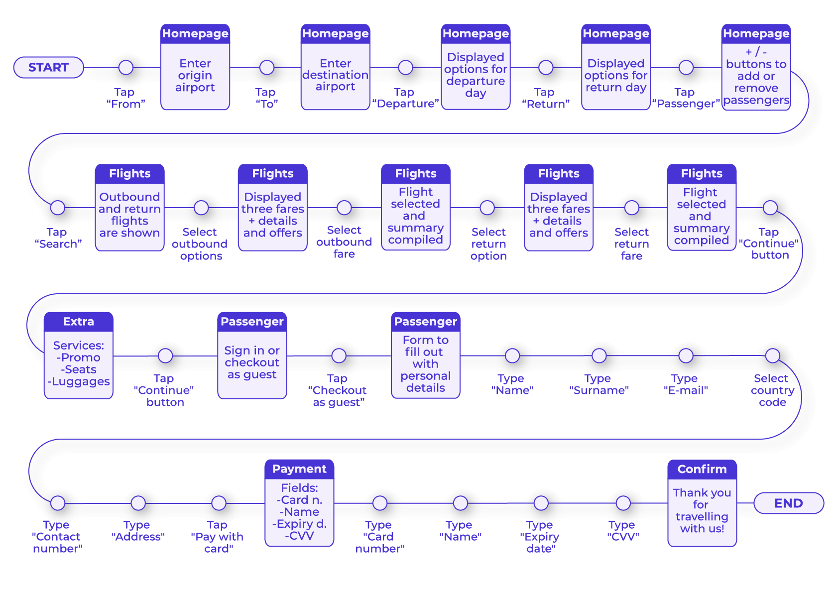 After identifying key issues, I prioritized designing new ideas and features. My initial aim was to simplify the booking process, seeking to minimize steps and clicks, as illustrated in my flow diagram.